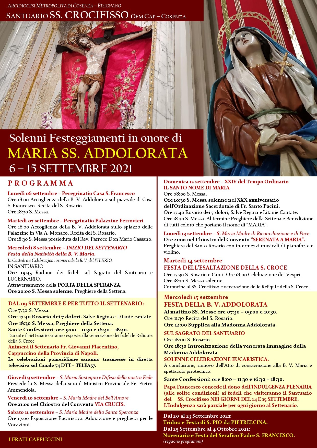 Mercoledì 15, festa della Madonna Addolorata, al mattino saranno celebrate SS. Messe alle 07:30, 09:00 e 10:30.