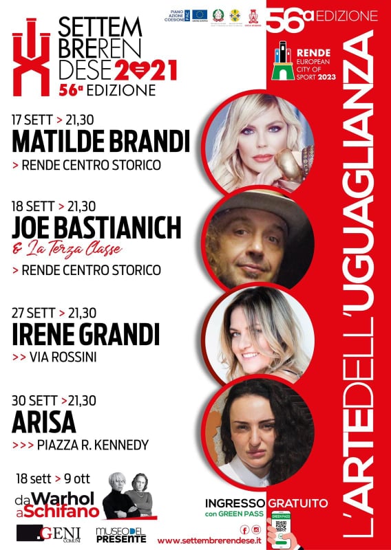 Proprio De Luca, di concerto con l’amministrazione comunale di Rende guidata dal sindaco Marcello Manna, ha inteso dedicare questa edizione del Settembre rendese ai Diritti Civili e alla Figura della Donna, e proprio una grande artista, come Matilde Brandi sarà la madrina del Settembre rendese 2021 e il 17 settembre nel centro storico condurrà la “Notte degli Artisti”.