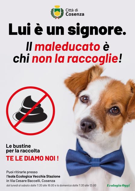Il claim della campagna di sensibilizzazione lanciata dal Sindaco Franz Caruso e dall’Assessore al Benessere e diritti degli animali Veronica Buffone campeggia sui manifesti che da oggi sono già affissi in città e sono in evidenza anche sui social e sugli altri canali di comunicazione: “Lui è un signore. Il maleducato è chi non la raccoglie!” con , in basso, la foto di un cagnolino in papillon. Le bustine per la raccolta le fornisce direttamente l’Amministrazione comunale gratuitamente, grazie alla collaborazione con la società “Ecologia Oggi”, e si possono ritirare presso l’Isola Ecologica Vecchia Stazione di via Cesare Baccelli dal lunedì al sabato, dalle ore 7,30 alle 16,00 e, la domenica, dalle 7,30 alle 12,00.
