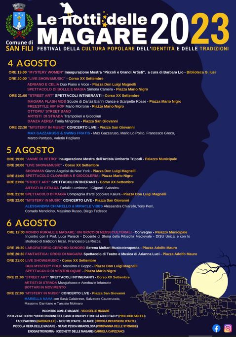 La kermesse si svolge nel centro storico del borgo e si compone di micro-manifestazioni di diversa natura: premi letterari, performance artistiche e musicali, laboratori, proiezioni, mostre, fiere, degustazioni e vendita di prodotti tipici ed artigianali, incontri con le Magare. L’evento, giunto alla XIV edizione, inserito nel più ampio Festival estivo promosso dall’Amministrazione Comunale, che prende il nome di San Fili TerraMagarae, si terrà, come da tradizione, nel primo fine settimana di agosto e, in particolare, il 4-5-6 agosto 2023.