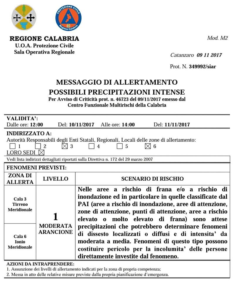 E’ appena stato diffuso per la nostra regione un nuovo bollettino della Protezione Civile Calabria: