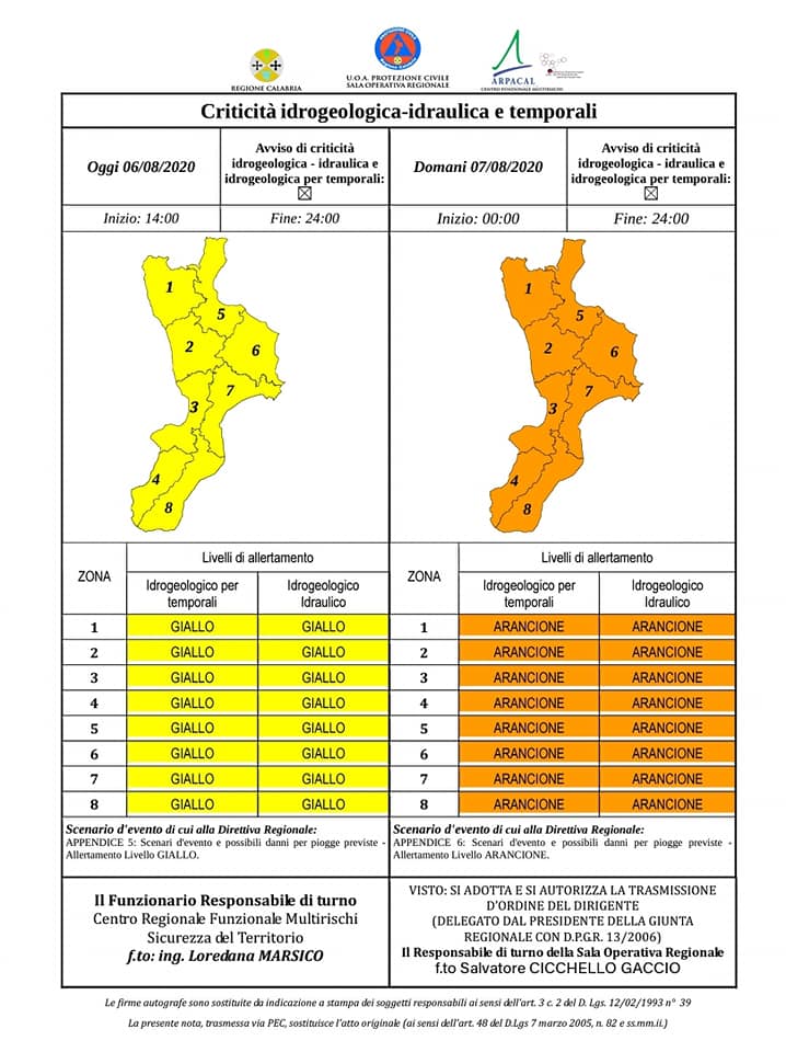 Questo il bollettino ufficiale pubblicato poco fa dalla Protezione Civile Calabria: