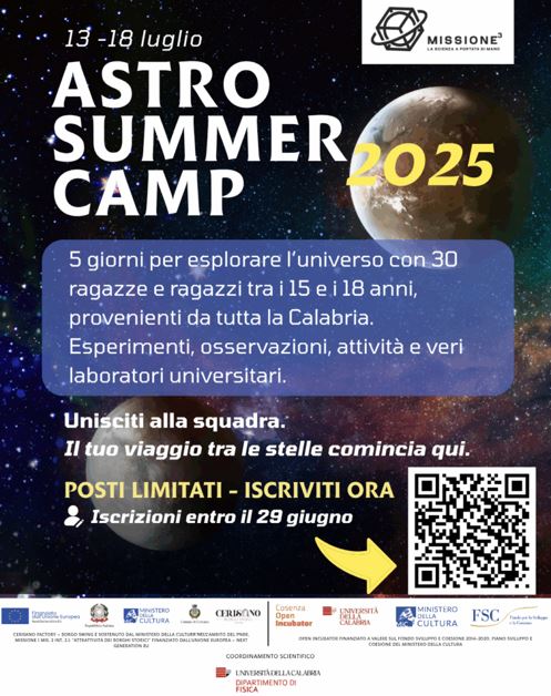 Dal 13 al 18 luglio 2025, presso lo storico Palazzo Sersale di Cerisano (CS), 30 studenti e studentesse dai 15 ai 18 anni di età  vivranno un’esperienza unica tra laboratori scientifici, osservazioni astronomiche e incontri con ricercatori