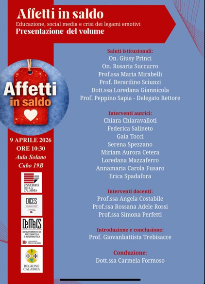 Giovedì 9 aprile 2026, alle ore 10:30, presso l’Aula Solano, Cubo 19B, all’Università della Calabria, si terrà la presentazione del volume Affetti in saldo