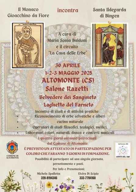 Nella giornata iniziale sarà Giuseppe Riccardo Succurro, presidente del Centro Internazionale di Studi gioacchiniti, a far dialogare il simbolismo di Gioacchino da Fiore e le visioni mistiche di Ildegarda di Bingen introducendo il pubblico alla potenza di questo incontro, mentre il medico nucleare Carmen Romor attingendo alla dimensione quantistica saprà stimolare i partecipanti ad intuire perché l’apporto di due monaci così lontani nel tempo possa essere tanto valido ancora oggi sia su un piano filosofico sia su un piano di vita quotidiana.