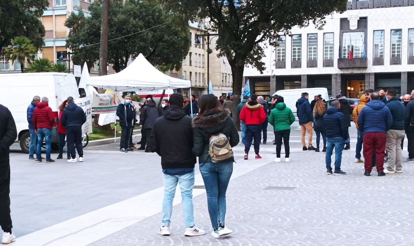 “«Da green a siamo tutti a spass». È uno degli striscioni mostrato dagli ambulanti campani, siciliani, pugliesi e calabresi scesi in piazza a Cosenza per chiedere la riapertura delle fiere. Circa un centinaio i commercianti riuniti a piazza dei Bruzi e in attesa dell’esito dell’incontro con il sindaco”