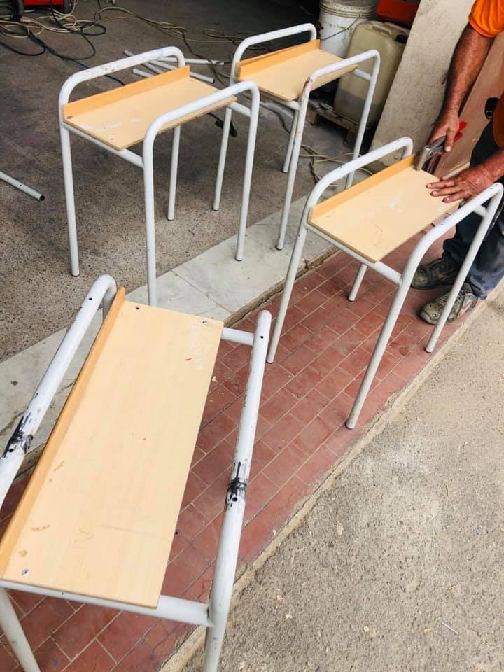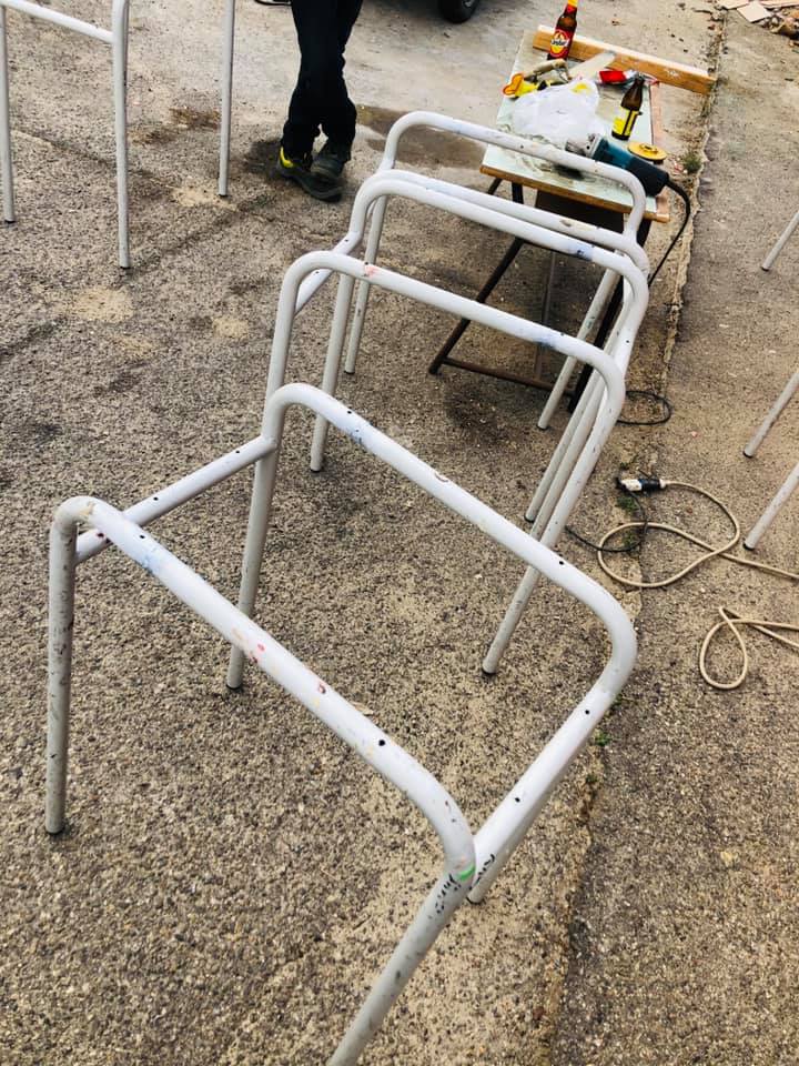 Dopo un certosino lavoro di taglio, di saldatura, di levigaggio e di assemblaggio ecco pronti i banchi monoposto quasi indistinguibili rispetto a quelli originali (come si può vedere in foto).