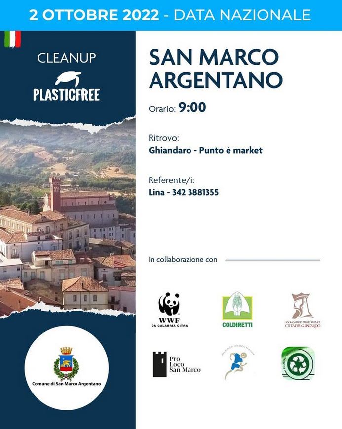 Si ringrazia per l’organizzazione Lina Esposito, referente locale di Plastic Free e l’assessore all’ambiente Fenisia Di Cianni del comune di San Marco Argentano. Per il patrocinio all’iniziativa si ringrazia la Pro Loco di San Marco, la coldiretti sez. di San Marco, l’associazione sportiva “Atletica Argentanum”, il WWF Calabria citra e la società di raccolta rifiuti Ecology Green.