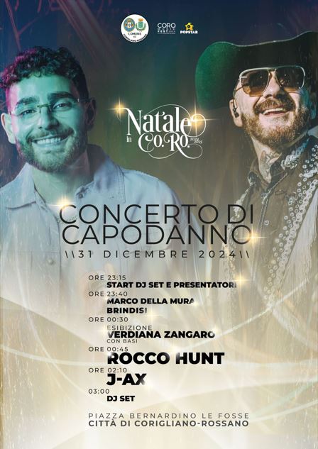 La serata partirà con la musica alle 23 in filodiffusione, poi alle 23:40 salirà sul palco Marco Della Mura. Seguirà countdown e brindisi di mezzanotte per salutare il nuovo. Sul palco sarà la volta di Verdiana Zangaro. Dopo i talenti di Corigliano-Rossano spazio a Rocco Hunt a J-Ax. A fine concerti la nottata continuerà con dj set di artisti locali.