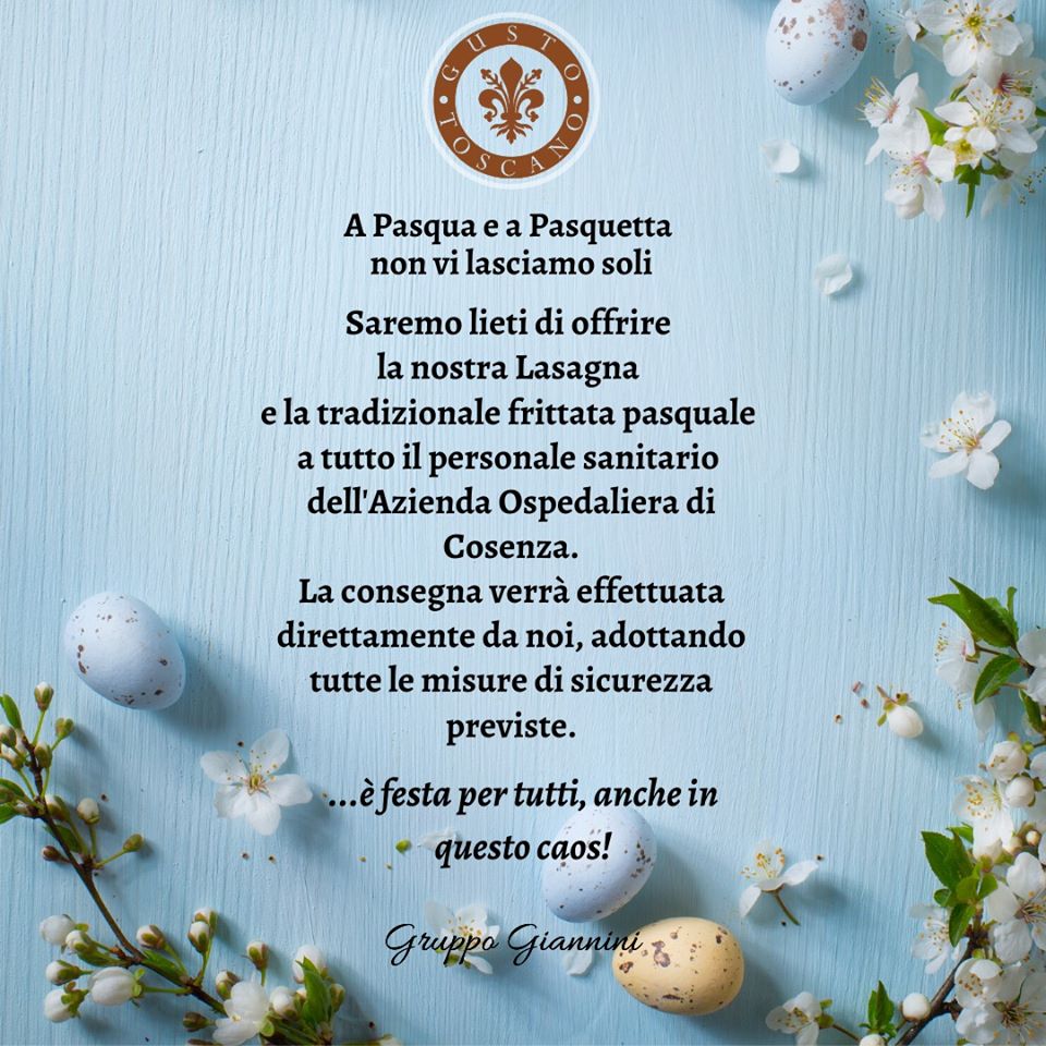 Per il pranzo di Pasqua e di Pasquetta, infatti, il ristorante offrirà la sua lasagna e la tradizionale frittata pasquale alle Forze dell’Ordine della nostra città e all’intero staff dell’Ospedale di Cosenza.