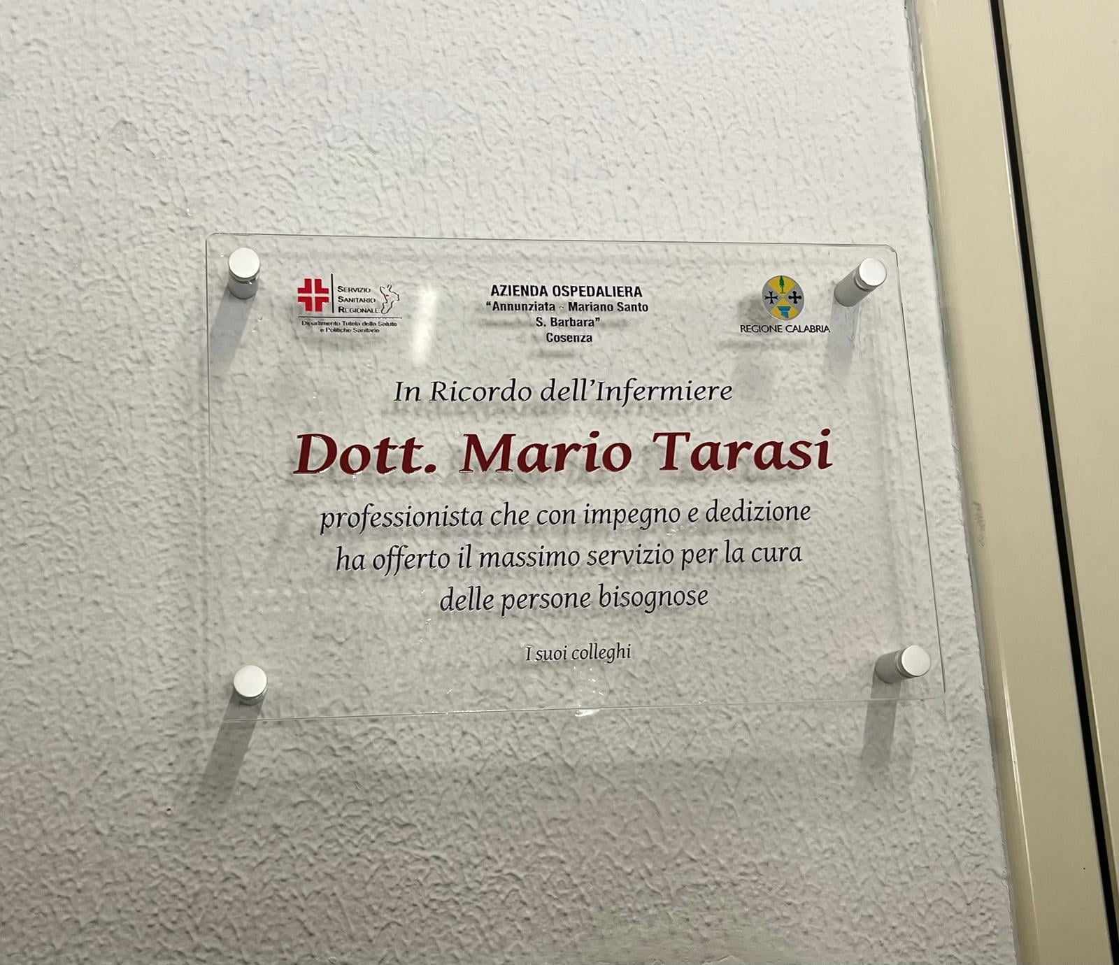 La targa riporta: “In ricordo dell’infermiere Dott. Mario Tarasi, professionista che con impegno e dedizione ha offerto il massimo servizio per la cura delle persone bisognose.”