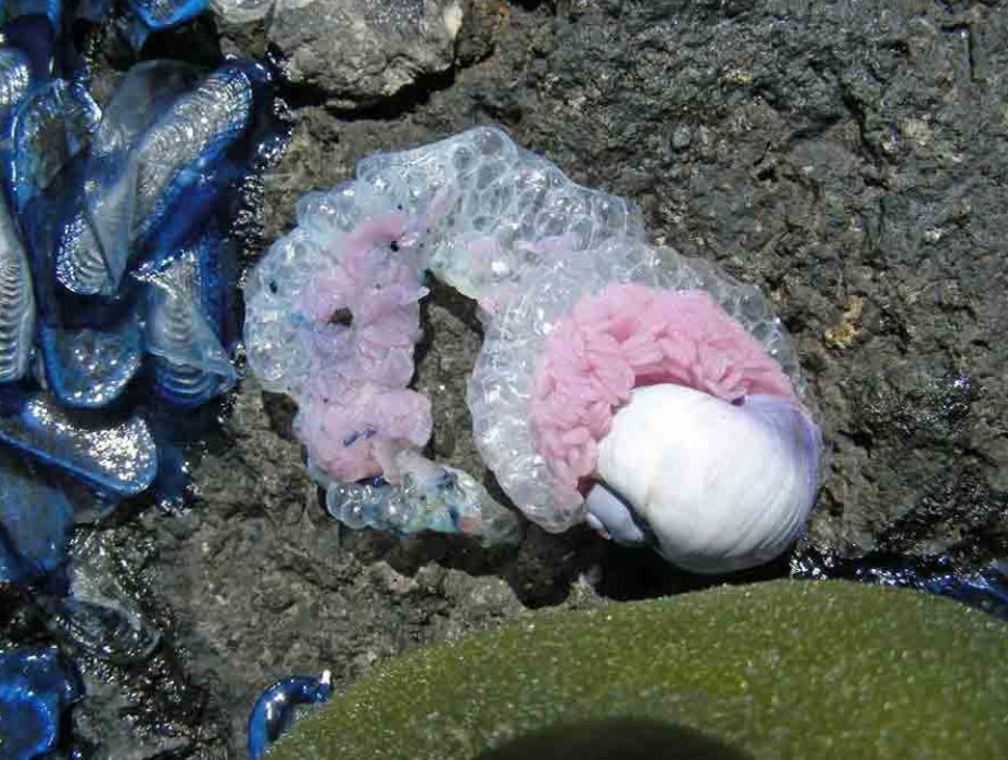 A scorgerli รจ stata Anna Lepore, 54 anni, mentre passeggiava col suo cagnolino che li ha fotografati e ha inviato le foto al biologo marino Luciano Bernardo. ”Si tratta di specie planctoniche e di mare aperto – dice Bernardo – che occasionalmente possono arrivare sottocosta. La chiocciola si chiama Janthina pallida e galleggia grazie a una zattera di bolle di muco su cui depone anche le uova rosa.”