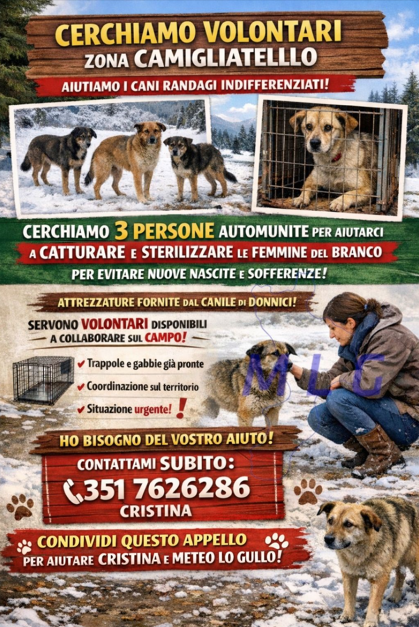Cristina sta cercando 3 persone della zona, preferibilmente automunite, disponibili a collaborare in un intervento mirato sul campo. L’obiettivo è individuare le femmine presenti in un branco di cani randagi, per poterle catturare in sicurezza e procedere alla sterilizzazione.