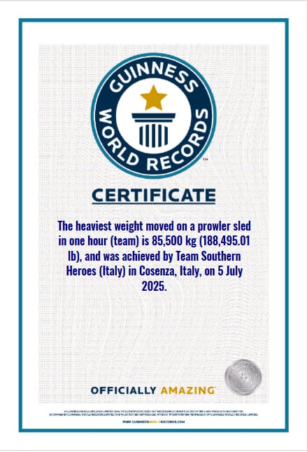 Un’impresa sportiva di livello mondiale porta Cosenza sotto i riflettori internazionali. È stato ufficialmente approvato dal Guinness World Records il primato stabilito la scorsa estate in città dal Team Southern Heroes, che ha conquistato il record nella categoria “Il peso più pesante spostato su una slitta da caccia in un’ora”.