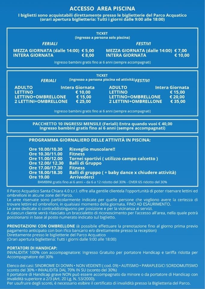 Ricordiamo a tutti che le prenotazioni possono avvenire via e-mail all’indirizzo parcoacquaticosantachiara4.0@gmail.com,