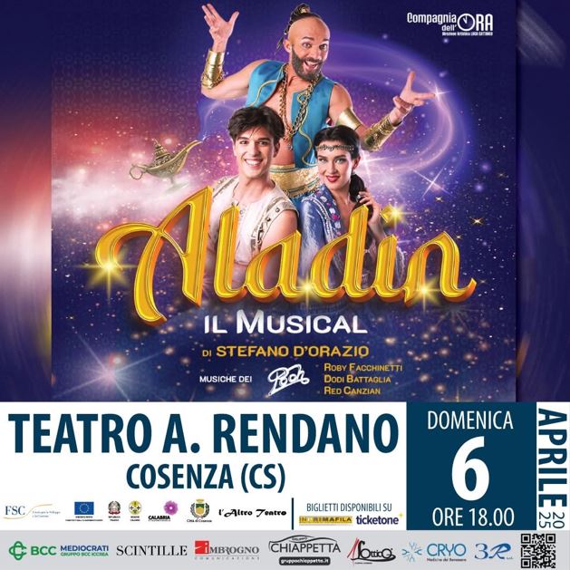 Diciotto musiche originali dei Pooh, la direzione musicale di Enrico Galimberti, le coreografie di Ilenia De Rosa, la regia e direzione artistica di Luca Cattaneo: il musical “Aladin”, prodotto dalla Compagnia dell’Ora, andrà in scena venerdì 4 aprile, ore 20.30, al Teatro comunale Vincenzo Scaramuzza di Crotone, per la Rassegna “Crotone…Voglia di Teatro”; sabato 5 aprile, ore 20.30, al Cinema Teatro Metropol di Corigliano Rossano con la “Rassegna L’Altro Teatro On-Stage Metropol”, inserita nell’ambito della Stagione “Il Teatro si fa in tre” del Comune di Corigliano Rossano; domenica 6 aprile, ore 18.00, al Teatro Alfonso Rendano di Cosenza per la “Rassegna L’Altro Teatro”.