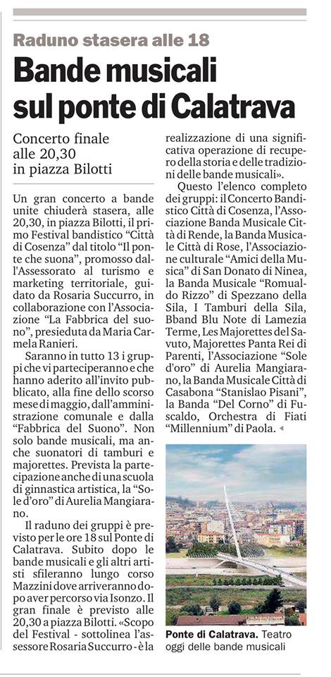 “L’assessorato al turismo e marketing territoriale di Palazzo dei Bruzi e l’associazione “La Fabbrica del Suono” sono lieti di invitarvi ad aderire al I Festival Bandistico, Majorette, Sbandieratori e artisti di strada città di Cosenza “Il Ponte che Suona”.