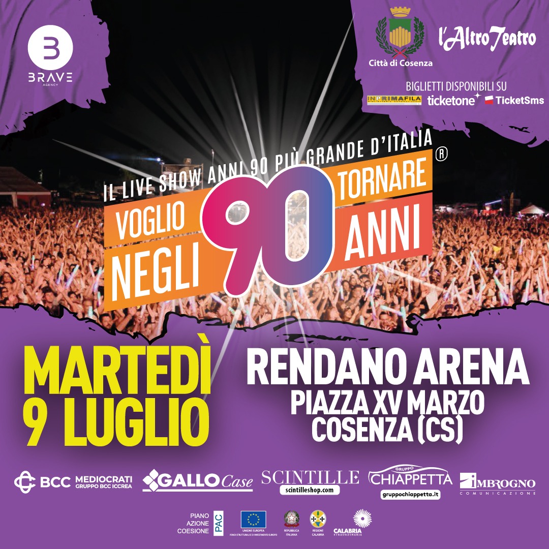 Rendano arena, in piazza XV Marzo il 9 luglio si balla con “Voglio tornare negli anni 90”. Rinviato al 21 novembre il concerto degli Estro Plays Genesis “Seconds Out”