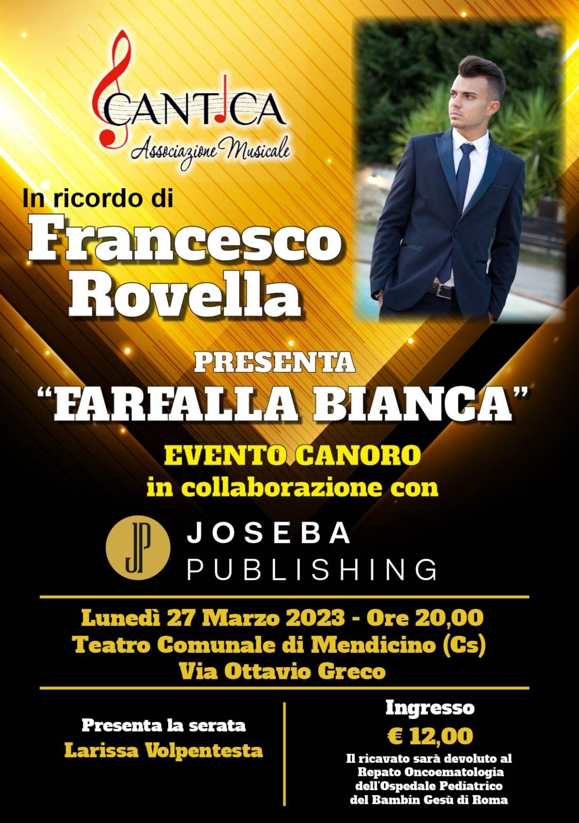 La serata, il cui ricavato sarà tutto devoluto al Reparto di Oncoematologia dell’Ospedale Pediatrico del Bambin Gesù di Roma, organizzato in collaborazione con Joseba Publishing, sarà presentato da Larissa Volpentesta e vedrà la partecipazione di Gianni Testa, insegnante e produttore discografico del nostro territorio, nonché parente di Francesco.