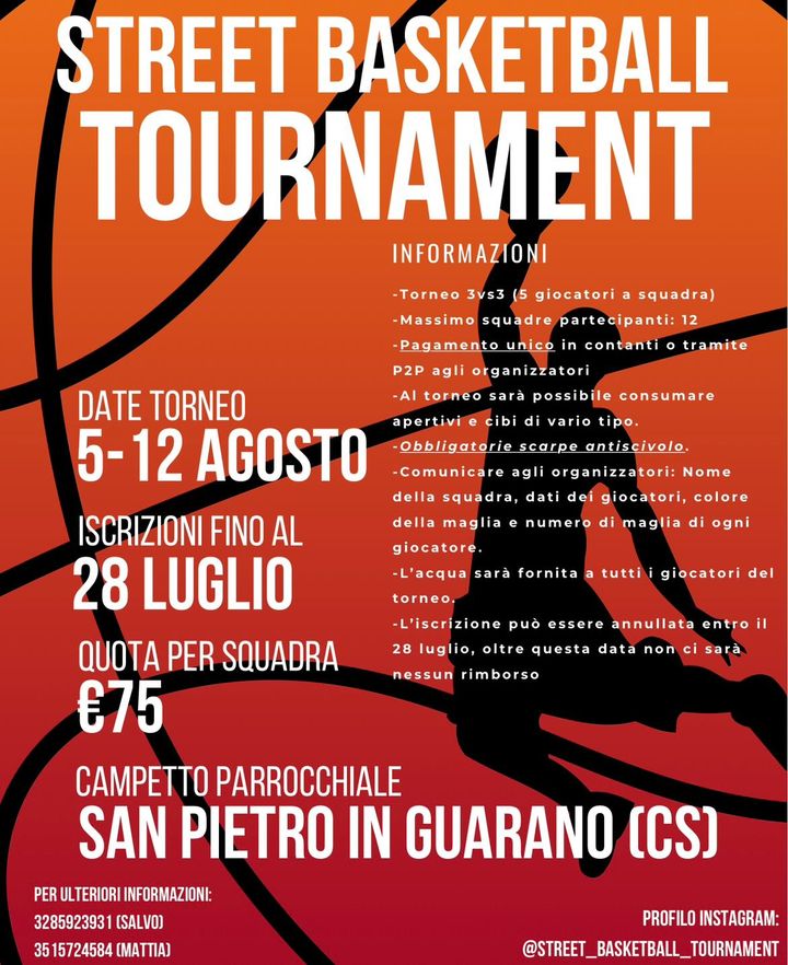 Come già accennato il torneo sarà 3vs3 e avrà luogo sul campetto parrocchiale di San Pietro in Guarano. Ogni squadra potrà essere composta da massimo 5 giocatori e l’ultima data utile per iscriversi è il 28 luglio.