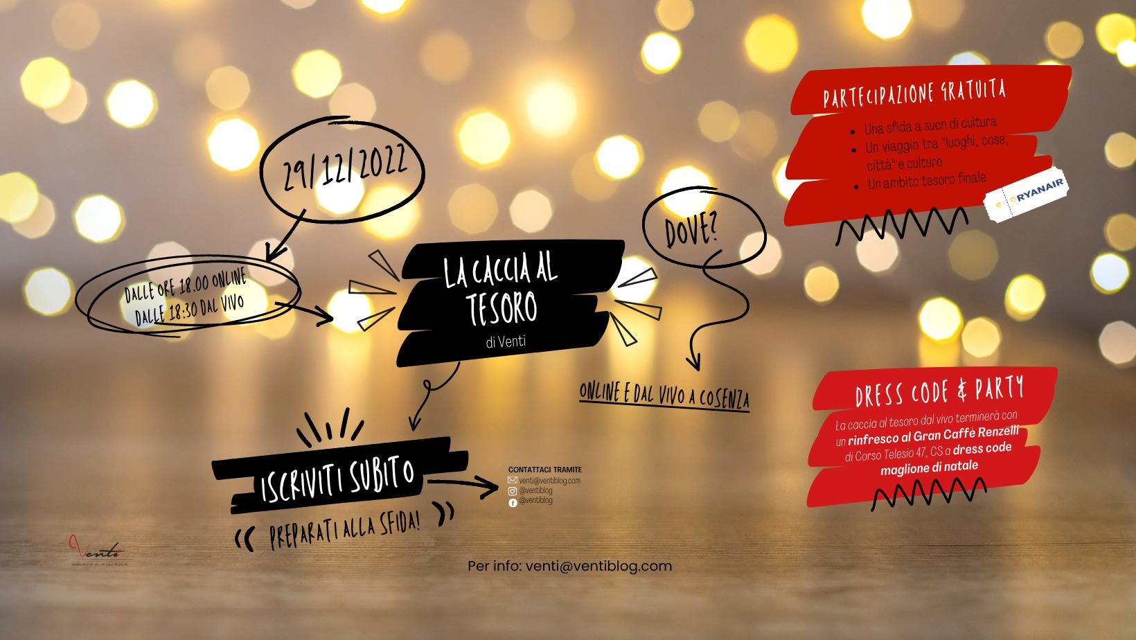 L’associazione Venti quest’anno ha deciso di festeggiare la fine dell’anno attraverso una doppia occasione di gioco e approfondimento culturale: una Caccia al Tesoro fruibile in due diverse modalità, online e dal vivo su Cosenza, affinché tutti possano andare incontro a contaminazioni, suggestioni, ispirazioni culturali e ovviamente al tesoro finale.