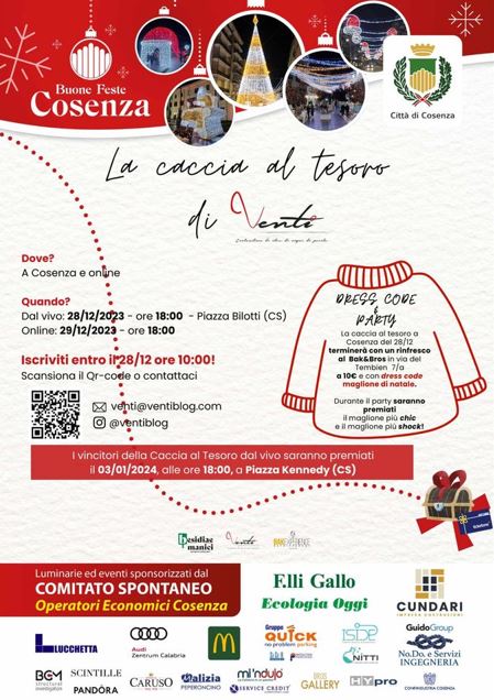“L’associazione culturale Venti, da sempre attiva sul territorio e attenta ai giovani e giovanissimi, ha deciso di festeggiare la fine dell’anno attraverso una doppia occasione di gioco e approfondimento culturale: una Caccia al Tesoro fruibile in due diverse modalità, online e dal vivo su Cosenza, affinché tutti possano andare incontro a contaminazioni, suggestioni, ispirazioni culturali e ovviamente al tesoro finale.