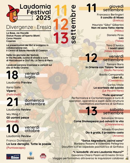 La giornata conclusiva (13 settembre), esplora l’eresia come pratica di riscatto individuale e collettivo. Salvatore Striano racconta il potere dei classici con Come Shakespeare può salvarti la vita (Chiarelettere). Alfredo Franchini propone Dio è gratis, il prossimo costa (Arcana), lampi saggistici tra etica, media e costume. A seguire il docufilm “Sanus egredieris, uscirai sano” di Barbara Rosanò e Valentina Pellegrino, centrato sull’ex ospedale psichiatrico di Girifalco. Gran finale con il viaggio performativo “L’autodafè: chi era Laudomia Mauro?” di Giovanna Chiara Pasini, Ernesto Orrico e Bassoprofilo, attraverso le inquisizioni calabresi, per riannodare storia, territorio e memoria delle “eretiche” del Sud.