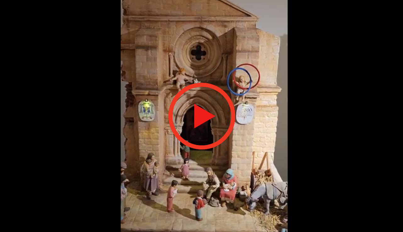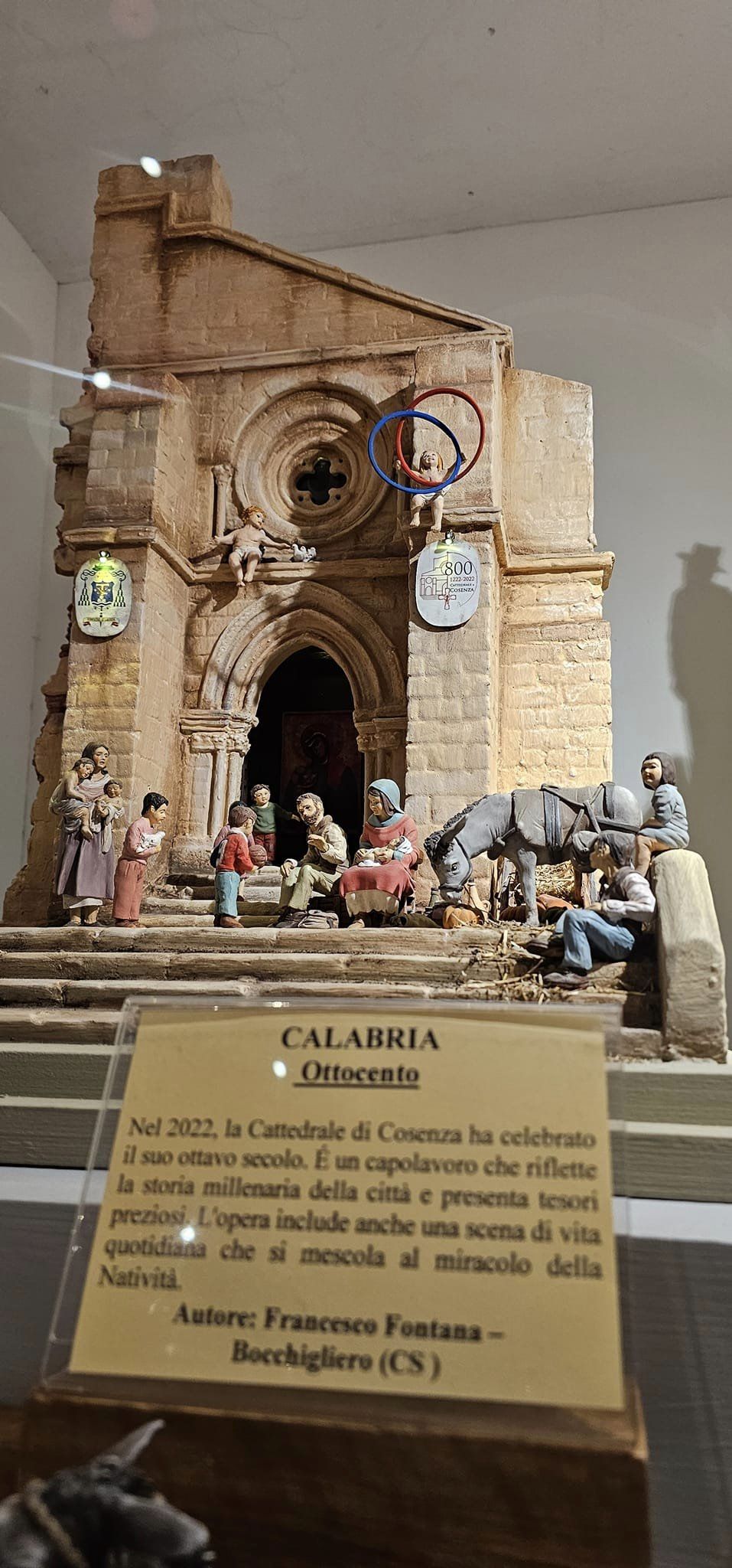 L’opera vuole celebrare gli Ottocento anni della Cattedrale di Cosenza, ne ripropone uno scorcio e ne esalta i tesori più preziosi. Una scena di vita quotidiana assorbe il miracolo della natività, i bimbi interrompono il loro gioco, il piccolo che si rivolge a Giuseppe indossa la maglia rossoblu del grande Gigi Marulla e sui cornicioni, un Angelo gioca con i famosi “cerchi di Occhiuto”.
