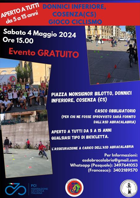AbraCalabria è lieta di annunciare l’evento dedicato ai giovani ciclisti a Donnici Inferiore, previsto per sabato 4 maggio