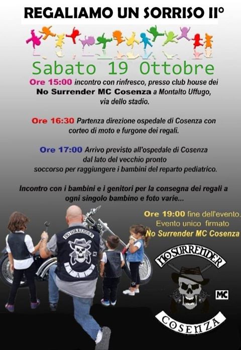 Chiunque volesse unirsi a noi, sia con che senza moto, è invitato a partecipare sabato. Ai doni per i bambini hanno già pensato i No Surrenders MC Cosenza“