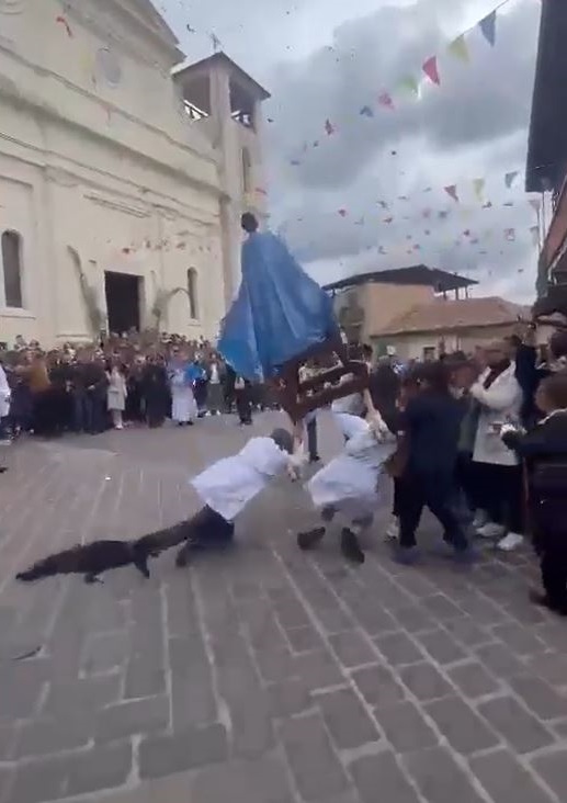 La statua sfiora il terreno ma viene risollevata dai presenti che accorrono ad aiutare i portatori.