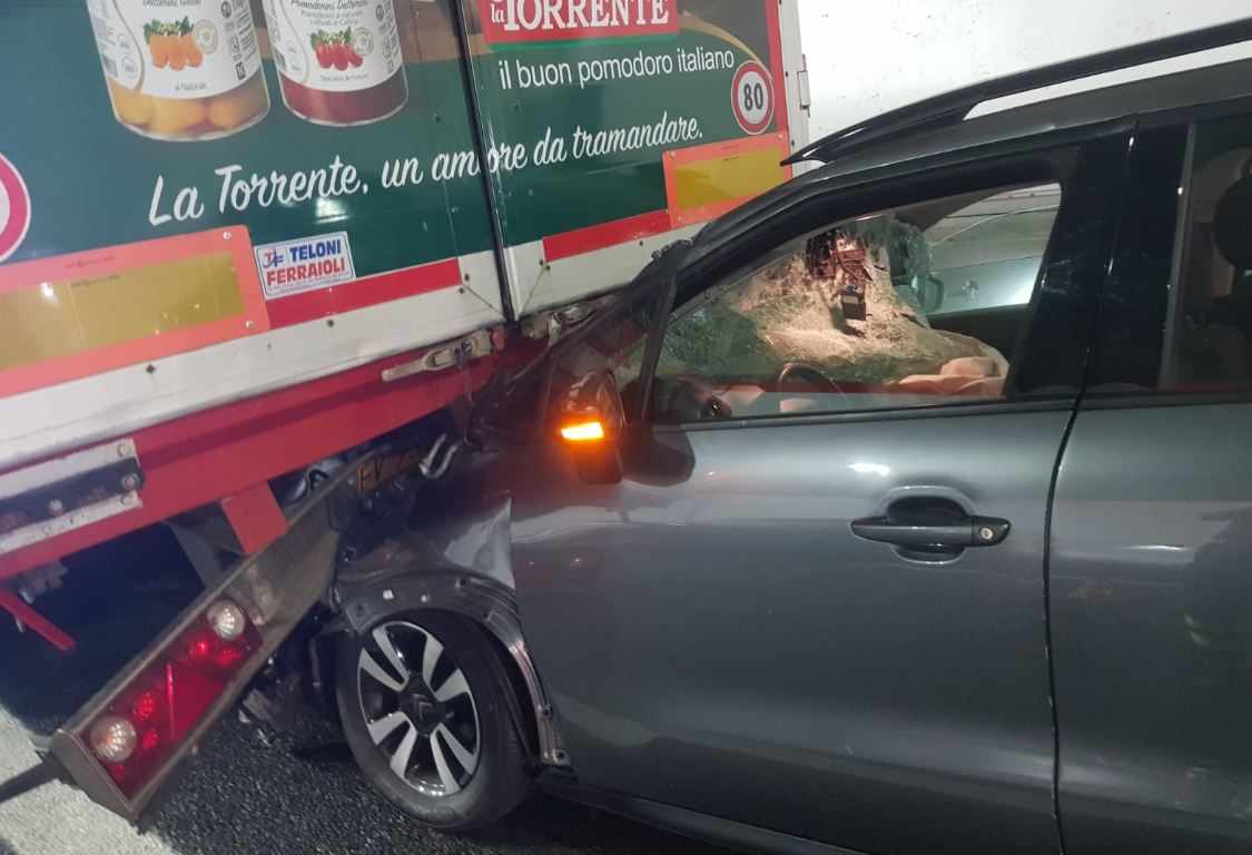 “Incidente stradale A2 nella galleria Serraspiga direzione nord, nei pressi dello svincolo di Cosenza Sud. Una Citroen ha impattato un tir, fortunatamente illeso il conducente.”
