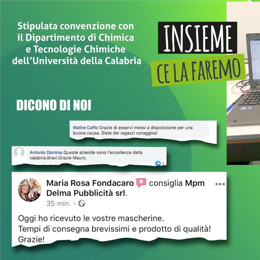 Abbiamo stipulata una convenzione con il Dipartimento di Chimica e Tecnologie Chimiche dell’Università della Calabria per la caratterizzazione chimico-fisica delle mascherine facciali da noi prodotte. Un’importante collaborazione per fronteggiare la diffusione del Covid-19 ed un particolare ringraziamento al Prof. Amerigo Beneduci, al Dott. Antonio Tursi, alla Dott.ssa Giuseppina Corrente ed al Direttore del Dipartimento Prof.ssa Alessandra Crispini.“