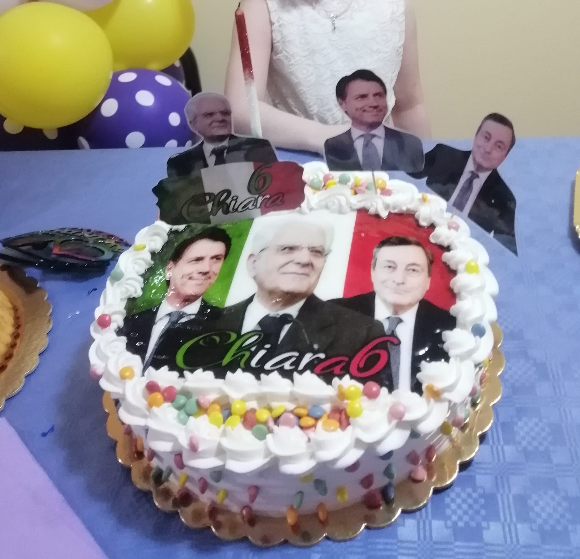 Chiara Aloise ha 6 anni, vive a Bisignano, e come ogni normalissima ragazza della sua età che si rispetti (ok, forse un po più spigliata del solito) …per il suo compleanno ha scelto un tema un po ‘alternativo’. Prova ne sia che sulla sua torta spadroneggiano Mattarella, Conte e Draghi…