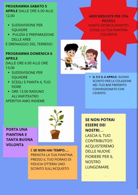 In occasione dell’evento, alcuni bar del territorio offriranno buoni sconto per la colazione ai partecipanti. Chi non potrà essere presente potrà comunque contribuire prenotando una piantina presso il proprio fioraio di fiducia, ottenendo uno sconto, oppure effettuando una donazione che sarà destinata all’acquisto di nuove fioriere per il lungomare.
