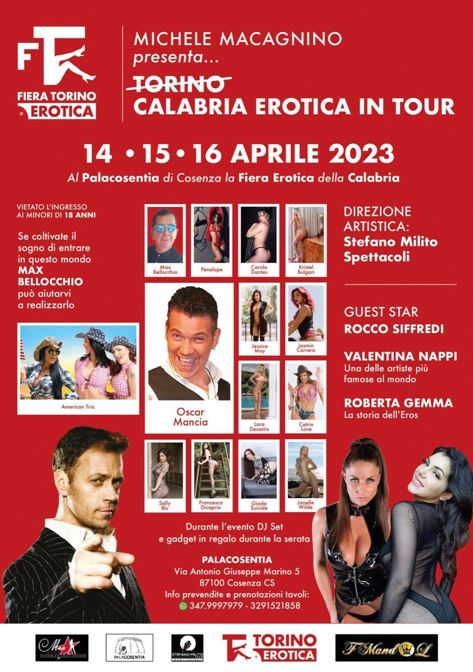 La manifestazione è in programma dal 14 al 16 aprile negli ampi spazi del Palacosentia. Dopo Pasqua la città di Cosenza si trasforma dunque nel centro dell’erotismo della penisola italiana: per un’intero fine settimana, da Nord a Sud, con l’edizione “calabrese” di “TorinoErotica”, storica fiera di settore che di solito è organizzata nel capoluogo piemontese ma, nell’innovativa edizione 2023 accende la città di Cosenza. A primavera, che è la stagione dell’amore per antonomasia, la cittadina calabrese si prepara ad accogliere la moltitudine di visitatrici, visitatori e professionisti che per 3 giorni animano la piccante kermesse erotica, tra stand e selfie con i fan. Sono infatti attese a Cosenza alcuni tra le più importanti protagoniste e protagonisti dell’intrattenimento a luci rosse, che sono volti noti della tv nazionale, del lifestyle e del mondo dello Spettacolo. A partire dall’ospite d’onore, che è il celebre regista e produttore di cinematografia per adulti: Rocco Siffredi. Il leggendario pornodivo, di cui è prevista a breve su Netflix la serie ispirata alla strabiliante biografia, è atteso in Calabria per incontrare le tante e i tanti ammiratori, durante i 3 giorni della kermesse in città. Oltre al mitico attore hard originario di Ortona (Ch), tra i nomi più attesi per accendere la primaver di Cosenza a “TorinoErotica” c’è l’attrice hard italiana Valentina Nappi, Star campana del Cinema internazionale per adulti, tra le interpreti più amate anche negli Stati Uniti. Ma a Cosenza sono presenti anche alcune giovani e promettenti protagoniste del settore, già attive nelle interpretazioni sui set a tripla X. Come la giovane attrice abruzzese di origini venezualane, Jasmine Carrera, che recentemente è stata elogiata come “fuoriserie” sulle pagine del magazine di lifestyle nazionale MOW, nonché Giada Suicide, pornattrice che è anche tra le partecipanti di una delle stagioni del reality game sul dating delle coppie, trasmesso su Discovery. E sono davvero molteplici, le artiste e gli artisti attesi dal 14 al 16 aprile a Cosenza, tra cui: Kristel Bulgari, Jessica Moy, Catrin Love, l’American Trio, Penelope, Carola Dantes, Lara Desantis, Janelle Wilde, Sally Blu, Francesca Dicaprio, solo per citare alcuni dei nomi più noti. Le stelle dell’adult entertainment e dell’erotismo sono pronte a splendere in Calabria, insieme a fan e visitatori da tutt’Italia, dal 14 al 16 aprile a Cosenza per l’edizione 2023 di “TorinoErotica”.