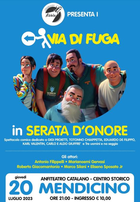 Giovedì 20 luglio, alle ore 21, presso l’Anfiteatro Catalano nel centro storico di Mendicino, si esibirà il gruppo comico “I Via di Fuga”.