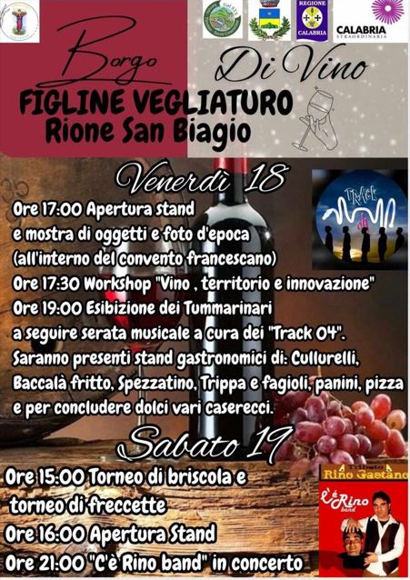 Alle ore 17:30 workshop di presentazione dell’evento “Vino, territorio e innovazione”, saranno presenti i rappresentanti delle cantine locali che ci racconteranno le loro esperienze e la storia della vinificazione sul territorio. A seguire ci sarà l’esibizione dei tummarinari e il concerto dei “Track 04”.