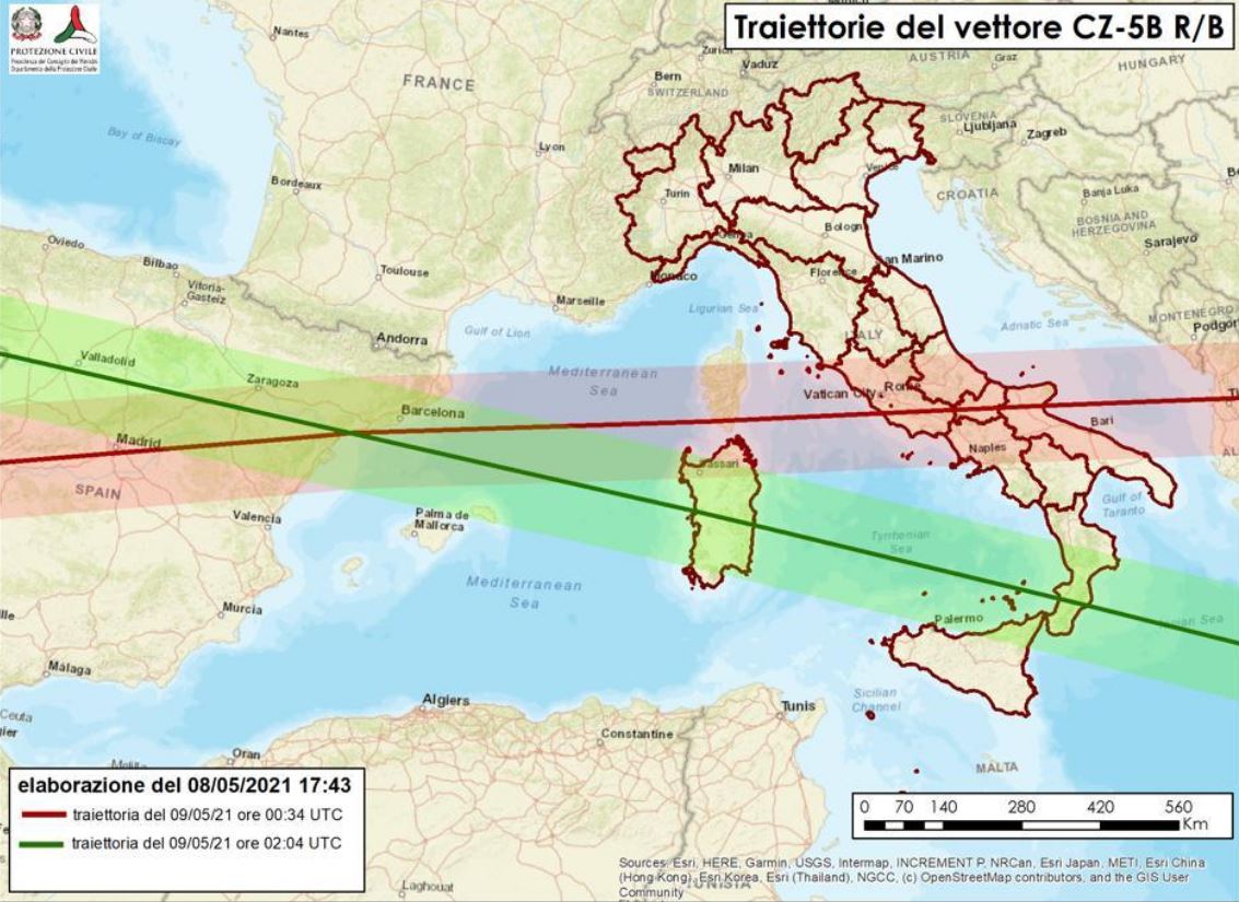 “Sulla base degli ultimi dati forniti dalla Agenzia Spaziale Italiana (ASI) durante il nuovo incontro del tavolo tecnico presieduto dal Capo Dipartimento Fabrizio Curcio, si è ulteriormente ridotta la finestra temporale relativa al rientro sulla Terra del lanciatore spaziale cinese “Lunga marcia 5B”, e questo consente di escludere la prima delle tre traiettorie inizialmente individuate.