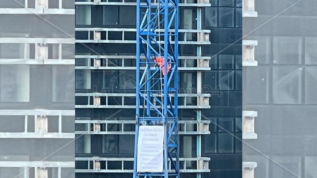 “Un uomo, ancora non identificato, è salito sulla gru del palazzo di giustizia in costruzione e sta minacciando di lanciarsi nel vuoto. Questo gesto estremo è accompagnato da un messaggio esposto su uno striscione appeso alla gru dallo stesso uomo: «Giustizia giusta la cerco la voglio – si legge -. Quando l’ingiustizia diventa legge, ribellarsi è un dovere al diritto».”