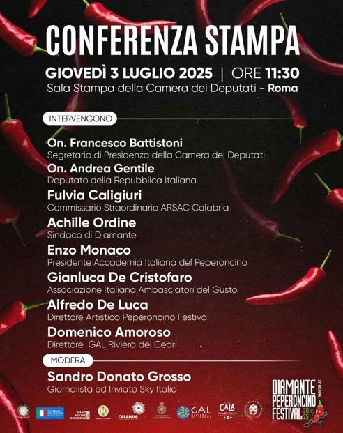 Giovedรฌ 3 Luglio alle ore 11.30 appuntamento nella Sala Stampa della Camera a Roma con Enzo Monaco, presidente dellโAccademia Italiana del peperoncino; il sindaco di Diamante Avv. Achille Ordine; lโOn. Francesco Battistoni, segretario di Presidenza della Camera dei Deputati; lโOn. Andrea Gentile; Fulvia Caligiuri direttrice ARSAC Calabria; Alfredo De Luca direttore artistico del Peperoncino Festival , Domenico Amoroso, direttore del Gal Riviera dei cedri e Gianluca De Cristofaro, Associazione italiana ambasciatori del gusto, modera la presentazione il giornalista Sandro Donato Grosso inviato di Sky Italia.