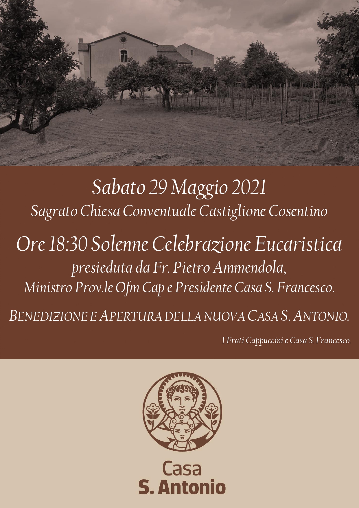 Sabato prossimo 29 maggio, la Fondazione Casa S. Francesco d’Assisi dei Frati Cappuccini di Cosenza, inaugurerà la nuova realtà di accoglienza che sta sorgendo nell’antico convento di Castiglione Cosentino: la “Casa S. Antonio”