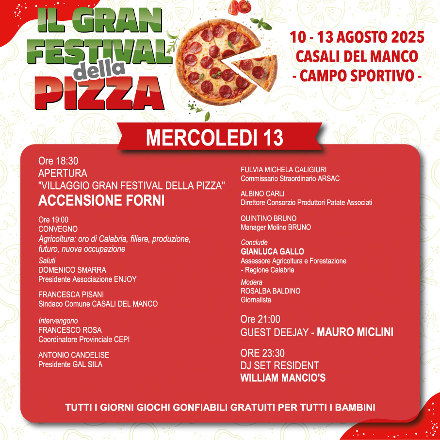 Questa terza edizione punta anche a rafforzare il ruolo strategico dell’evento nella promozione del territorio. I sindaci del comprensorio di Casali del Manco e rappresentanti istituzionali della Regione Calabria hanno sostenuto la manifestazione come occasione di valorizzazione delle risorse locali, stimolo al turismo e leva per la crescita dell’economia silana. Il Gran Festival della Pizza di Casali del Manco si conferma così piattaforma di cultura, gusto e inclusione, capace di parlare a tutti e di valorizzare un patrimonio che unisce, accoglie e fa festa.