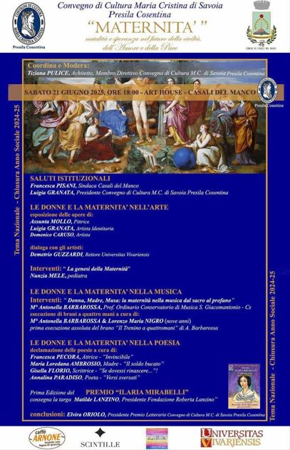 Sabato 21 giugno 2025 presso l’Art House – Macchia Casali del Manco, si terrà il convegno culturale Maria Cristina di Savoia della Presila, che conclude l’anno sociale 2024/25, dedicato al tema nazionale che quest’anno parla di Maternità