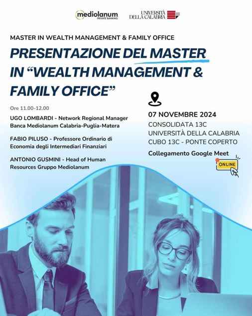 L’Unical presenta il primo Master di I livello in “Wealth Management & Family Office” in Calabria Novembre 4,12:00 AM By Redazione In EVENTI|News,Società,