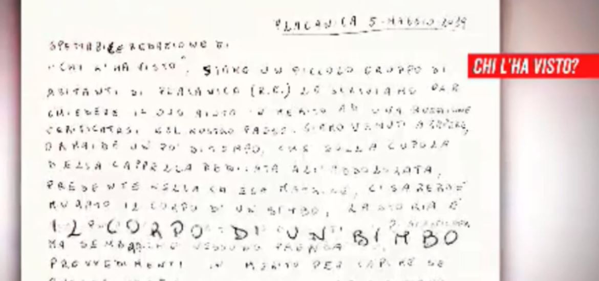“Chi l’ha visto?” ha riferito di una lettera secondo cui ci sarebbe il cadavere di un bambino nel sottotetto della cappella di Placanica.