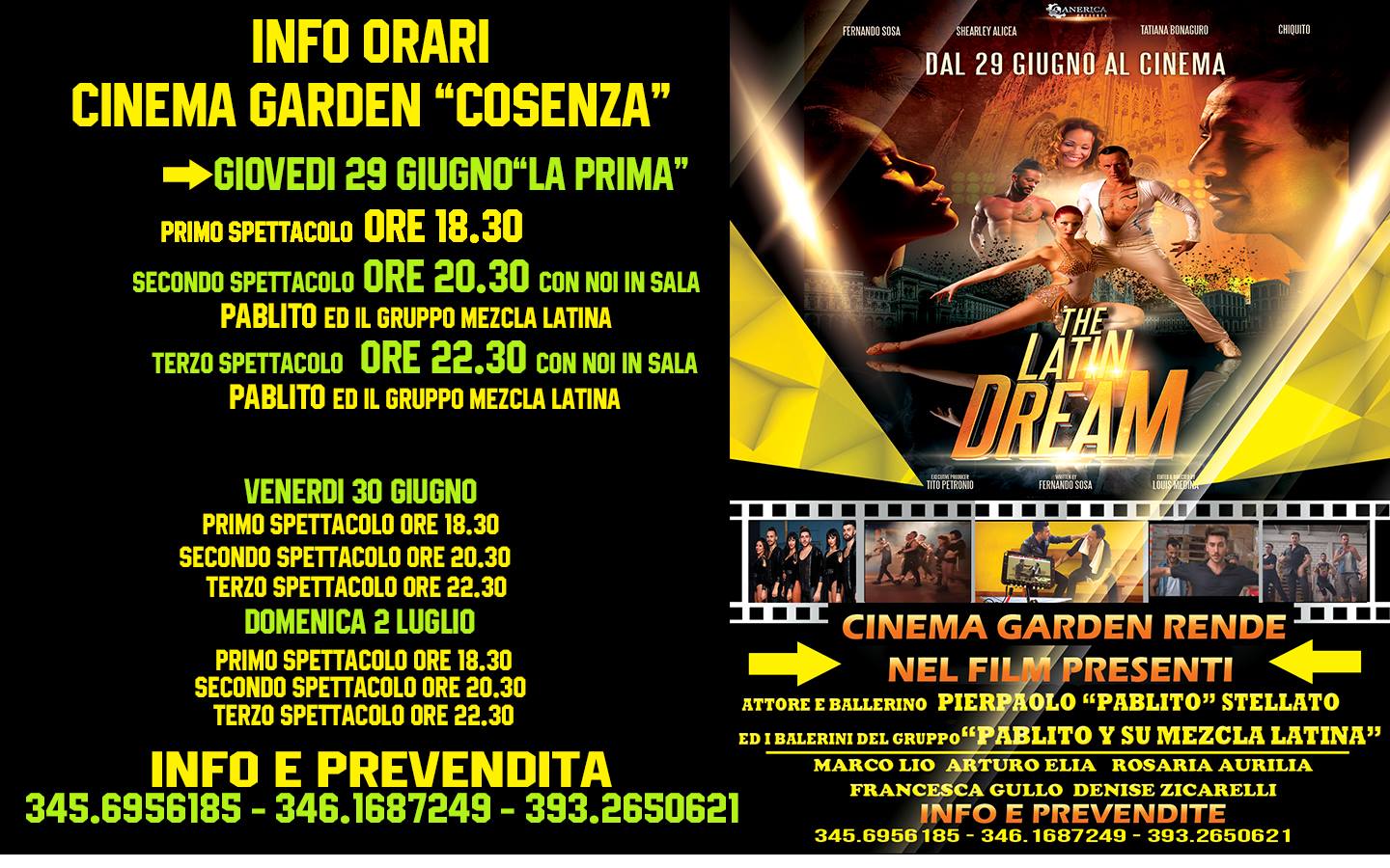 Ballerino affermato e molto popolare nel mondo caraibico, imprenditore e organizzatore di eventi (da anni a novembre organizza a Cosenza un grandissimo spettacolo di salsa Mi Tierra Latin Festival che coinvolge artisti famosi), oggi per Pablito e i suoi “allievi” (Mezcla Latina) è arrivata anche la prima esperienza da attori accanto agli “specialisti” dal ritmo latino. Il lato passionale e spontaneo della danza, un intreccio sentimentale e un tripudio alla salsa, questo ed altro in un film destinato a far stupire ed innamorare tutto il pubblico in sala. A partire da giovedì 29 giugno, “The latin dream” sarà proiettato al cinema “Garden” di Rende e nelle sale di tutta Italia.