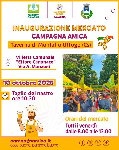 Tutto pronto per l’apertura del nuovo mercato di Campagna Amica – Coldiretti Calabria, che sarà inaugurato domani, venerdì 10 ottobre alle ore 10.30, nella Villetta Comunale “Ettore Canonaco” di via Manzoni, nella frazione Taverna