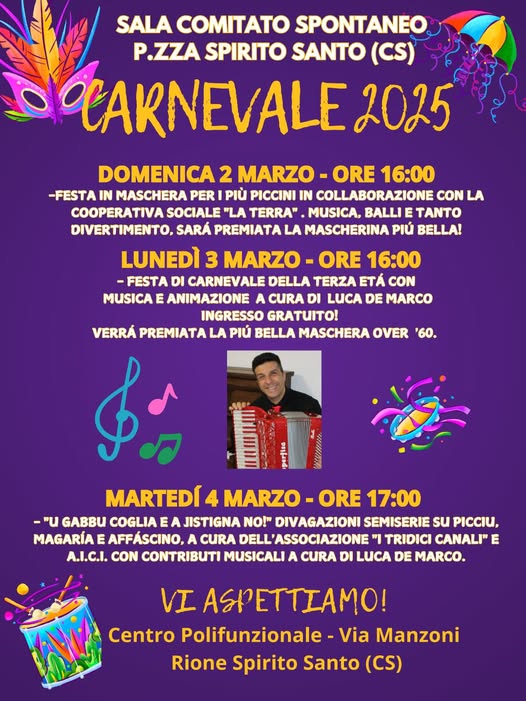 Lunedì 3 marzo ore 16:00 festa di carnevale della terza età con la musica di Luca De Marco e premiazione della più bella mascherina over 60.