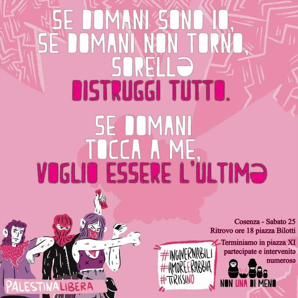Ci ritroveremo per una passeggiata arrabbiata a Piazza Bilotti alle ore 18:00, sabato 25 novembre, e concluderemo la camminata a Piazza XI settembre. Vi aspettiamo in piazza!”